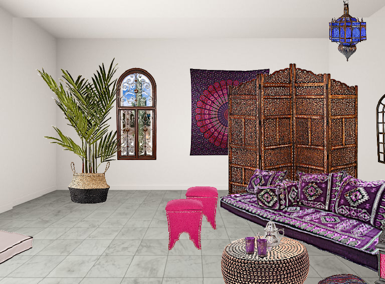 Below is a quick Casbah decor you can do on a budget. Note we limited the colors to blues/purples for a cleaner, more modern look.
